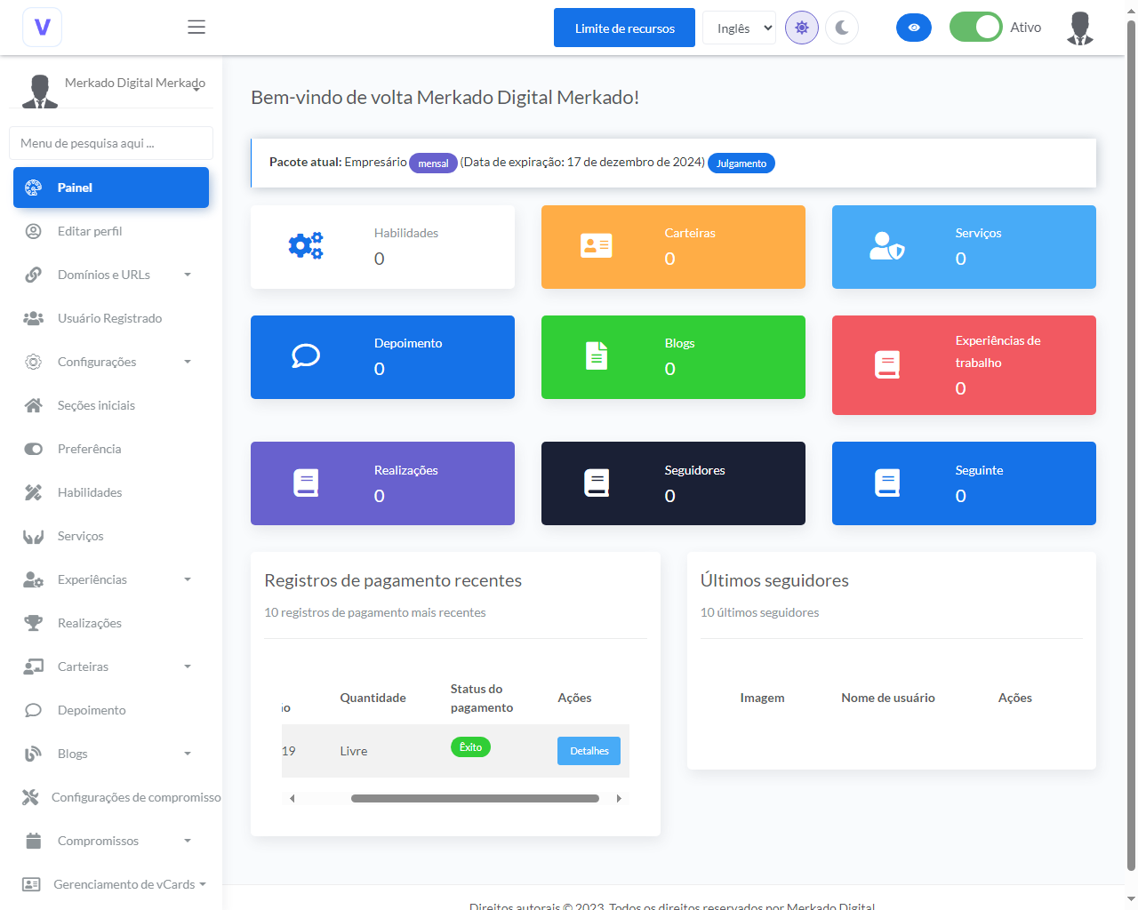 - Controle de limites para vCards, postagens de blogs, portfólios, serviços, habilidades, experiências de trabalho e educação, idiomas.