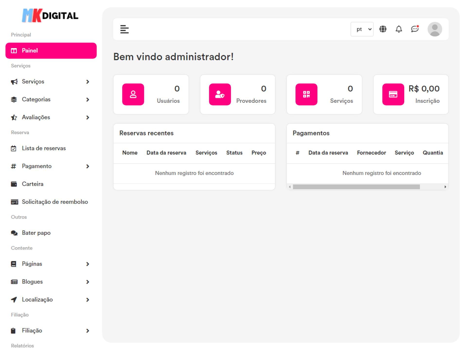 - Lista de serviços: O administrador pode visualizar todas as listas de serviços, e você também pode tornar o serviço ativo/inativo.