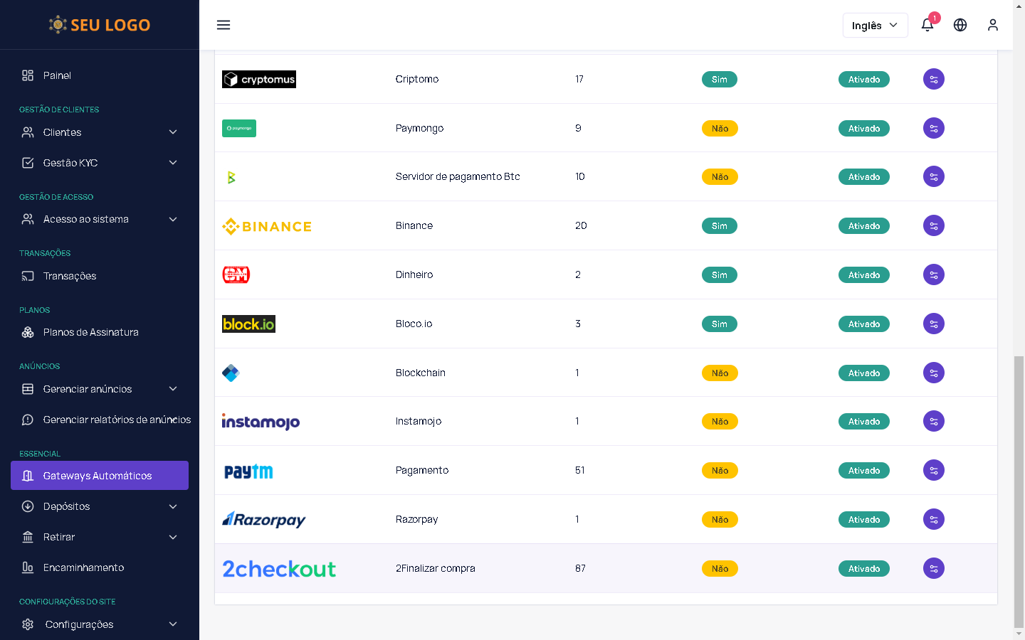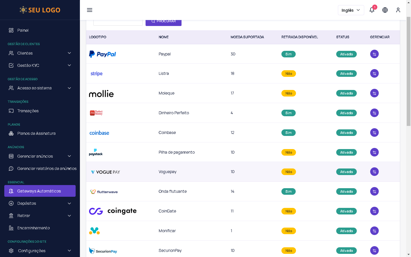 pode ver os gateways de pagamento automático para depósito e retirada. Ele pode definir várias moedas em um único gateway suportado. Vários gateways suportados por moeda estão disponíveis.