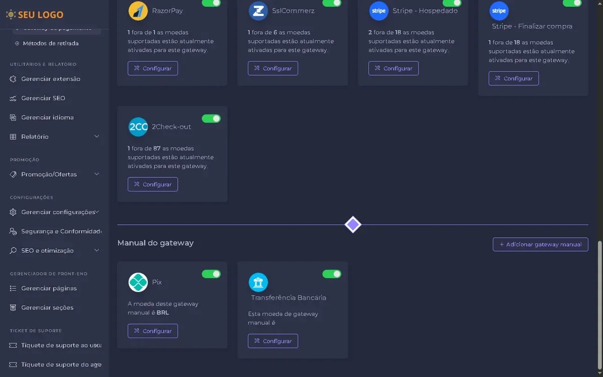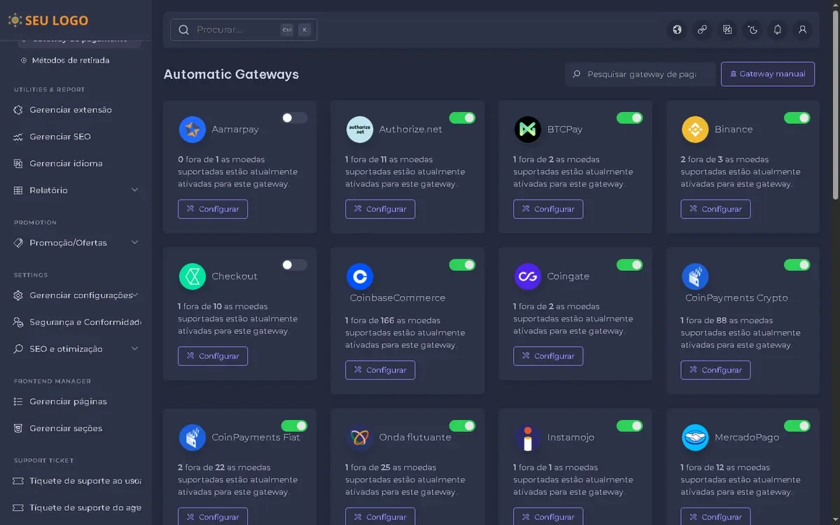 um painel de administração intuitivo e abrangente que fornece controle total sobre as operações da plataforma, desde o gerenciamento de usuários e transações até a configuração do sistema.