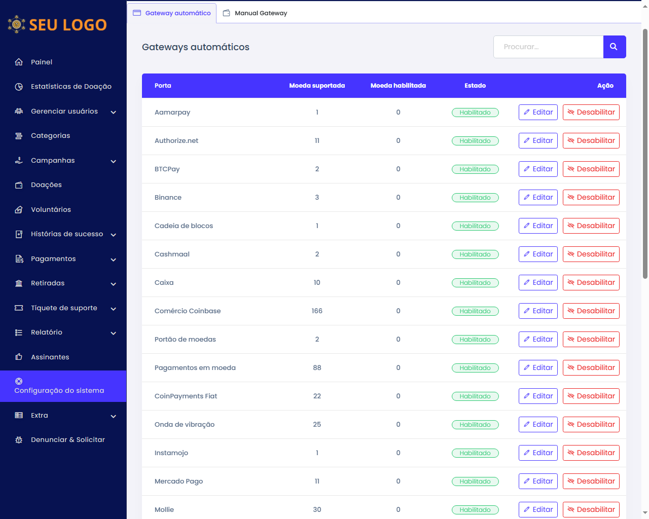 - Gerenciador de gateway de pagamento manual.